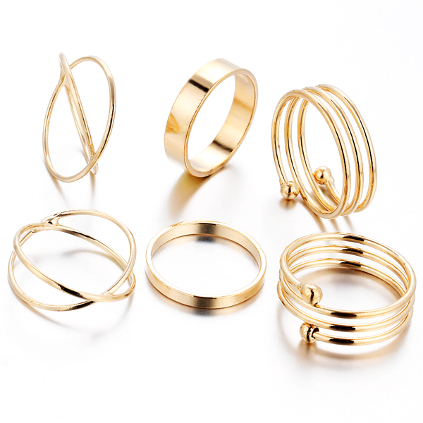 This trendy gold plated stackable ring set will make a bold edgy statement with any of your favorite outfits. Wear them all together or mix and match for a fun new look every day! This 6 piece set is available in a gorgeous gold finish. One size fits all.